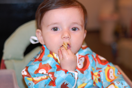 Tracie P has been chronicling our “baby-led weaning” here and it’s been a lot of fun: twice a day, Georgia P sits in her high chair and we offer her different foods to eat. She loves yogurt (with blueberries), her mango phase is already over, avocados are still in, steak is king and chicken is fun, too, and she even likes baba ghanoush!