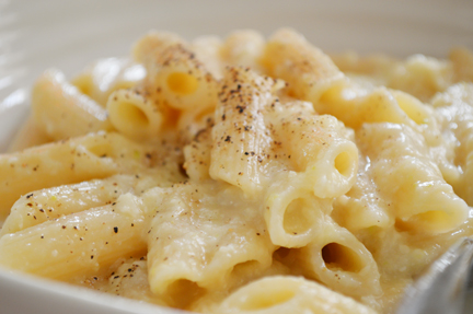 Before folding in the Rustichella d’Abruzzo (our house brand) penne, I added some of the pasta’s cooking water to the purée.