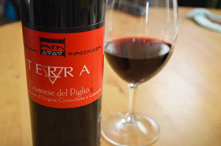 Above: Most Passerina comes from Abruzzo but this one, a 2011 by Macciocca, is raised in Latium (Lazio) in the township of Frosinone (Frusinate in dialect). It’s an example of the viticultural connection between Abruzzo and Latium, a relationship that’s even more evident in the regions’ gastronomic ties. This wine took a moment to open up and show its true colors but we both thought it was delicious once it did. Great acidity, balanced fruit, and a nice minerality that you don’t expect in Passerina.