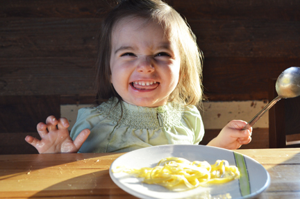 But the best dish — for reasons that are wholly self-explanatory (see above) — was the chitarra-shaped long noodles that he prepared for our daughter Georgia P and tossed with freshly grated Parmigiano Reggiano.