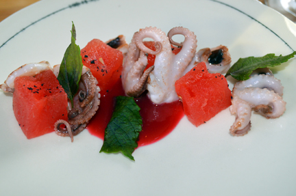 The texture of the baby octopus was like a gummy bear. In this dish, the quality of the materia prima was rivaled only by Chef Qui’s deft hand in how he delicately sautéed the cephalopod. Compressed, intensely flavored watermelon played counterpoint to its gentle saltiness.