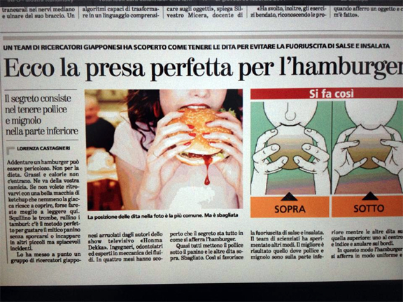 “Sinking your teeth into a hamburger can be dangerous,” writes Lorenza Castagneri. “Not for your diet. Fats and calories have nothing to do with it. It’s about your shirt. If you don’t want to find a nice ketchup splotch on your shirt — one that you can’t hide even with your jacket — you should probably read this. Let the trumpets ring out and let the drum roll: there is a perfect method to taste the legendary sandwich without soiling oneself or running into other small but unpleasant accidents” (translation mine).