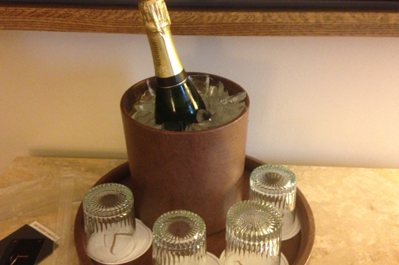 henriot champagneI surprised Tra with a chilled bottle of Henriot Blanc de Blanc, the wine we drank on our outbound flight on our honeymoon. As Tra likes to say, “we never leave home without it.”