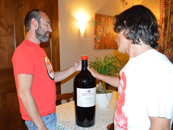I came to Langa this week to celebrate bromance Giovanni Arcari’s fortieth birthday. That’s Giovanni, left, wearing his “Greatest American Hero” t-shirt, and Barolo producer Ferdinando Prinicipiano, who gave Giovanni a 12-liter bottle of one of his top crus (Boscareto in Serralunga).