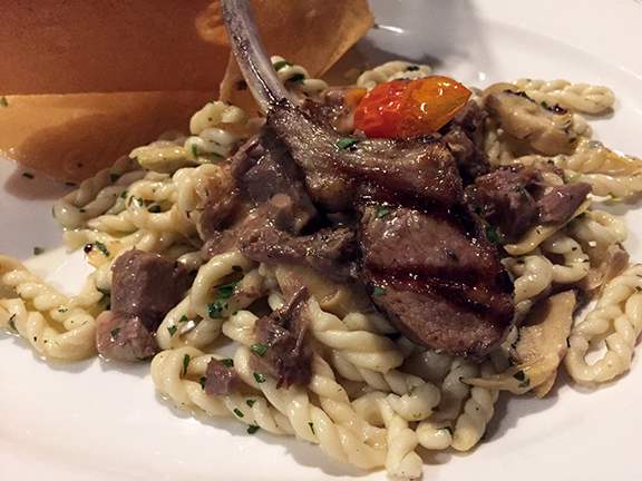 It was a brilliant pairing for a dish of lorghittas (below) with kid ragù and chop prepared by Efisio Farris at his Arcodoro, Houston’s Sardinian-restaurant and mainstay, where the tasting was held.