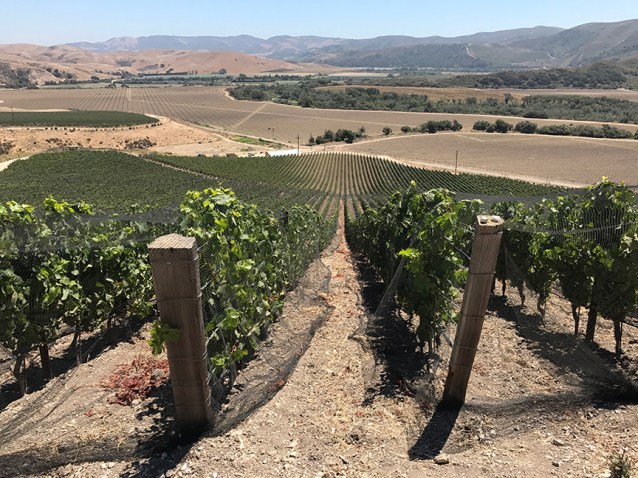 Lompoc in Santa Barbara County, where Domaine de la Côte grows its grapes, was another one of the eye-opening discoveries for me. When I woke up on Wednesday morning in Solvang, about 30 minutes inland from Lompoc, it was so cold that I had to wear a jacket when I went out for a Danish. Fog covered the valley. It was August 8. Today, August 10, the high is predicted to be in the low 80s and the low in the mid-50s. Could you think of better conditions (diurnal shifts) for ripening wine fine grapes? In Lompoc they’re beginning to pick their Pinot Noir this week.
