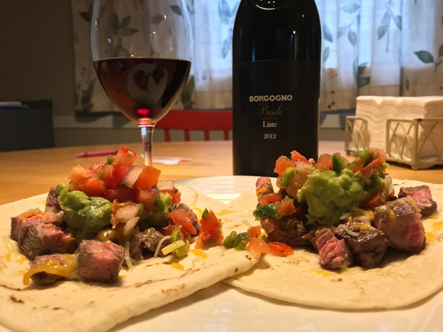 Single-vineyard designate Barolo and steak tacos piled high with spicy guacamole and pico de gallo…