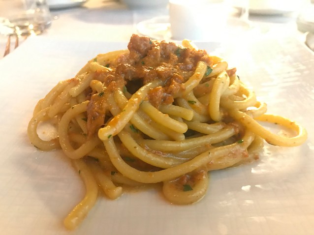 Bigoli with sea urchin (Locanda di Noris, Peschiera del Garda).