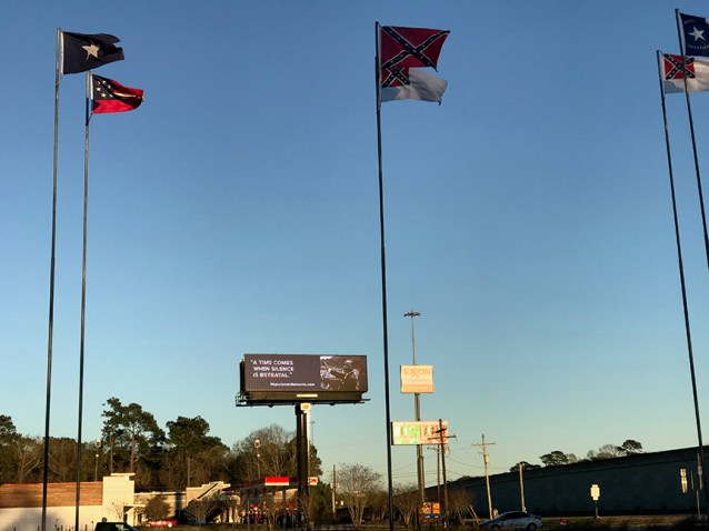 Thanks to the generosity of everyone who contributed to our GoFundMe campaign, not only did our Martin Luther King billboard appear over the newly erected Confederate memorial in Orange, Texas on Martin Luther King Day this year, but it continues to appear and has appeared for the entirety of African American History Month (February).