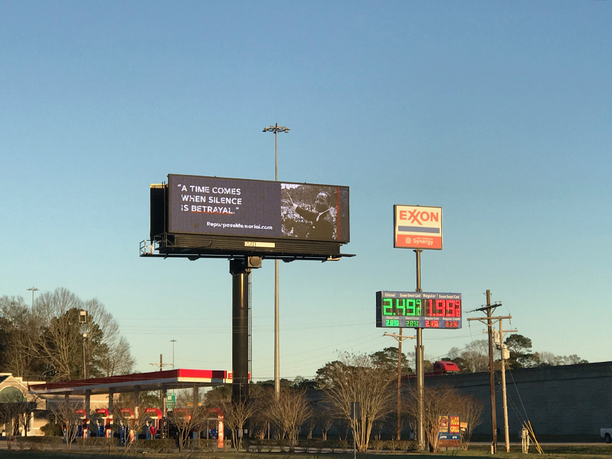 Thanks to the generosity of everyone who contributed to our GoFundMe campaign, not only did our Martin Luther King billboard appear over the newly erected Confederate memorial in Orange, Texas on Martin Luther King Day this year, but it continues to appear and has appeared for the entirety of African American History Month (February).