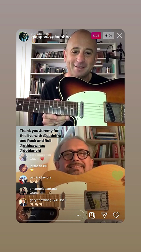 Last night’s dinner was the second virtual wine tasting event I took part in yesterday. Earlier in the day, I tasted some great Lugana with my buddy Gianpaolo Giacobbo via Instagram live stories — I was here in Houston and he in Montebelluna (Treviso province, Veneto). At the end of our chat, we even busted out our dueling telecasters and played an eight-bar blues (below).