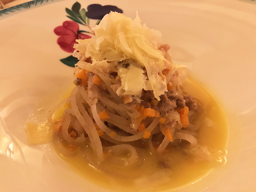 The purple top turnips had been julienned, soaked in red wine sediment and patiently cooked in a pot before being tossed with lovingly crumbled musetto, Friuli’s boiled pork sausage.