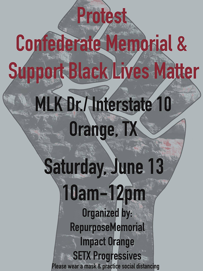 Tracie and I were already planning tomorrow’s protest of the newly built Confederate memorial in Orange, Texas where she grew up when we were contacted a couple of young women, sisters, who live there. They wanted to organize their own protest, they told us, and they were asking for our help.