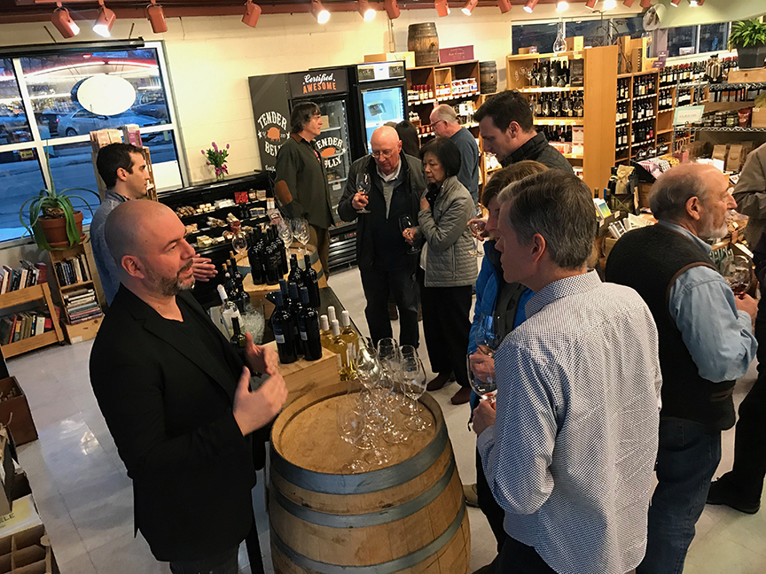 Above: a European winemaker hosts a tasting of his wines in Colorado in late February, 2020.