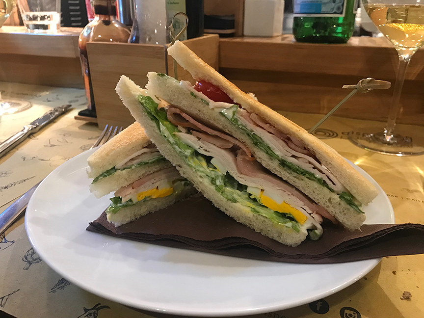 Club sandwiches. Yes, club sandwiches. Over the last decade or so, Italians have gone crazy for classic American cuisine. No joke. The only difference is that they use high-quality ingredients, including homemade mayonnaise. O how I wish I could treat you to a club sandwich and a glass of Franciacorta! Another Dispensa “new” classic.