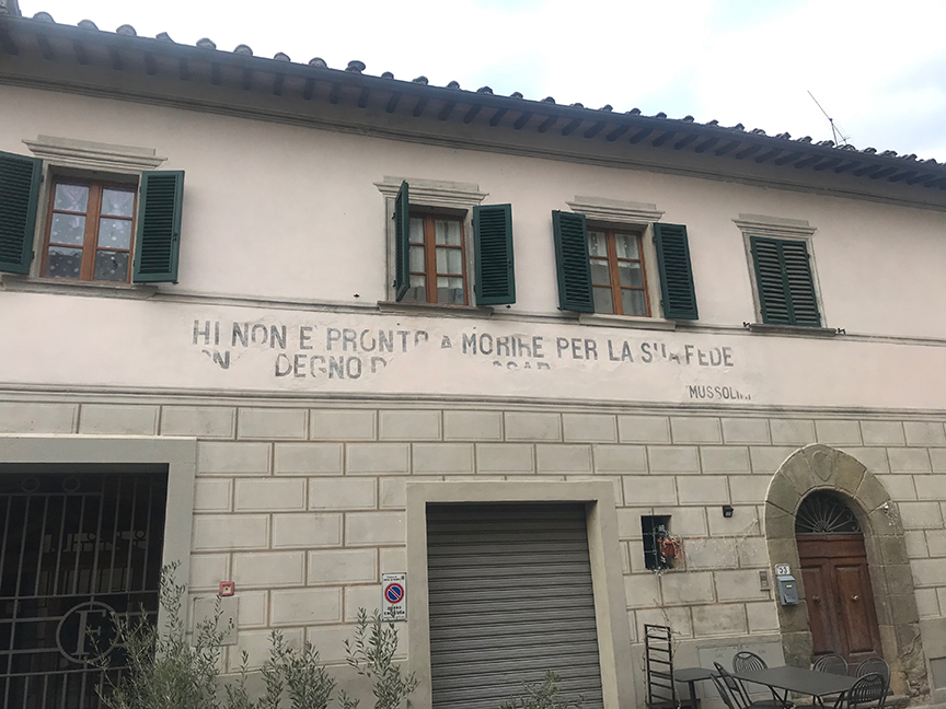 Fascist inscriptions, this one discovered in Tuscany. As a student of Italian history, I’ve always been fascinated by Fascism and Fascist-era art and iconography. “Chi non è pronto a morire per la sua fede non è degno di professarla” (“those not ready to die for their faith are not worthy of professing it”).