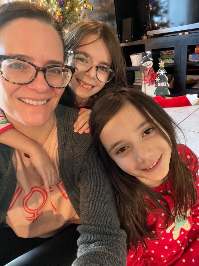 That’s a photo of the sisters, below, from earlier this year when the weather was still warm enough for them to perform their “pandemic flash mob” concerts on the street outside our house.