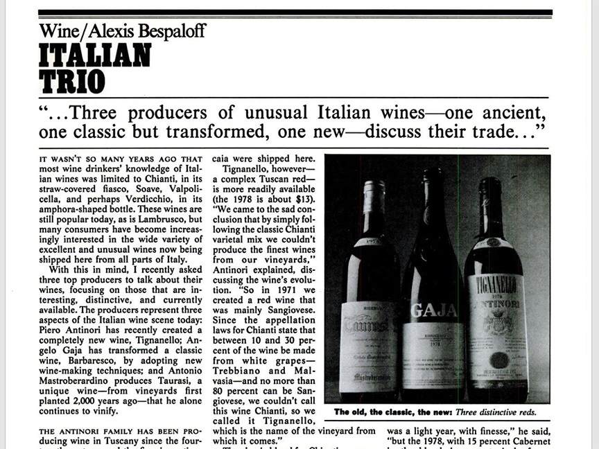 The messages bring to mind a 1982 New York magazine article by legendary wine writer Alexis Bespaloff where he features three then relatively (at least in America) Italian winemakers: Gaja, Antinori, and Mastroberardino. They were all trying to break into the U.S. market at the time.