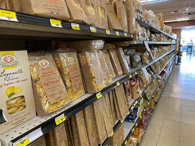 Above: the dried pasta selection at Corti Bros. takes up an entire aisle — a “gallery of [culinary] memory.”