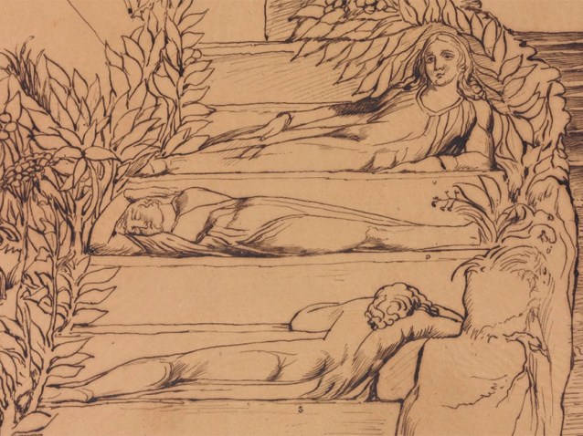 Above: “Dante and Statius Sleeping with Virgil Watching,” ink on tracing paper, after William Blake’s illustrations to the Divine Commedy, by John Linnell. Source: Beinecke Rare Book and Manuscript Library (Yale).