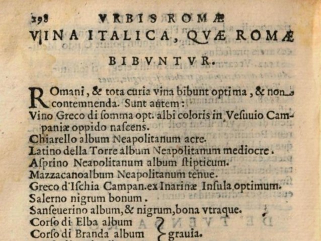 “The Romans and the entire [Papal] court,” he writes, “indisputably drink the best wines [in Italy]. They are as follows. The best is white in color, Vino Greco from Somma, which is grown in the town of Vesuvius in Campania…”