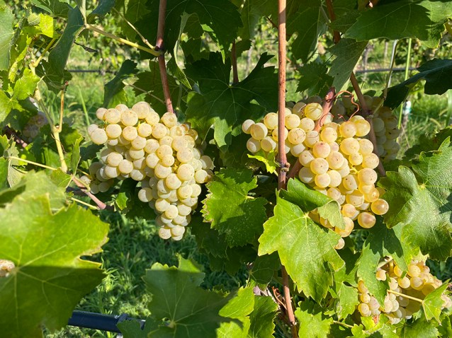 Above: Turbiana grapes photographed last week (September 14) in the Lugana appellation south of Lake Garda. Note the permanently mounted irrigation hose in the bottom of the image. “Emergency irrigation” was allowed across Italy in efforts to counter a drought that began in winter and persisted throughout the summer. Combined with prolonged, extremely high temperatures, it could have represented an existential threat to this year’s crop.