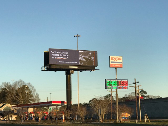 Every year since the site’s completion in 2017, we have raised billboards across the road that feature Dr. King and a quote from his writings and speeches. The image literally looks down over the memorial.