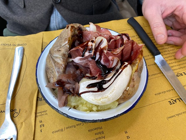 Over the last few years, I’ve seen more of these baked potato outfits pop up across Italy. The one I visited in Torino was packed. The Italians borrow the British jacket potato for their patata in giacchetta or baked potato, to keep it American over here on Do Bianchi.