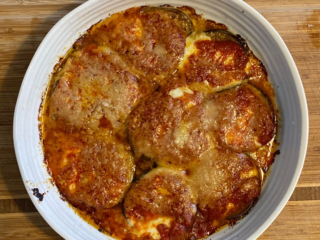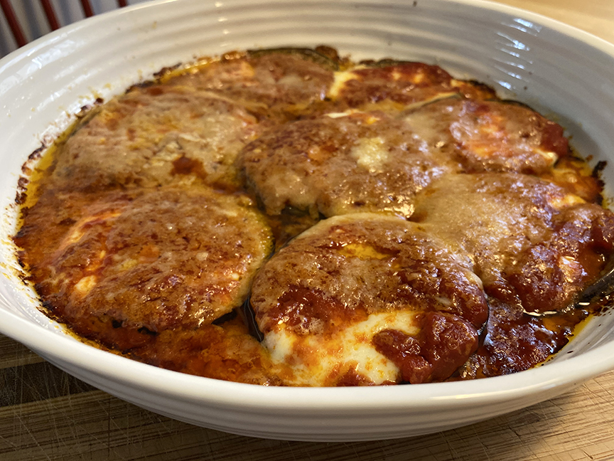 At our house, eggplant alla parmigiana is either reheated to be served at dinner or served room temperature for lunch or for a late afternoon snack. One of my favorite ways to serve it is as a sandwich on a favorite crusty bread. In my experience, letting it cool (and then reheating it) is key.