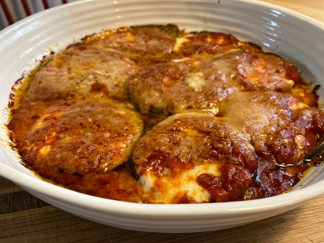 Grease an oven-ready casserole dish with olive oil. Add the eggplant rounds. Top with the sliced mozzarella. Smother with tomato sauce and top generously with the grated Parmigiano Reggiano. Fire the dish in a pre-heated oven at 350° F. for 30 minutes or until a golden brown crust forms. Remove from oven and cool.