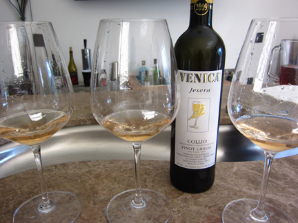I brought over a bottle of 2009 Pinot Grigio Jesera by my friend Giampaolo Venica. Look at the wonderful ramato (copper) color of this true Pinot Grigio (a red grape, btw). We raised a glass of this delicious salty wine and remembered the grape growers in Collio (Friuli) whose vineyards were devastated over the weekend by a terrible hailstorm.