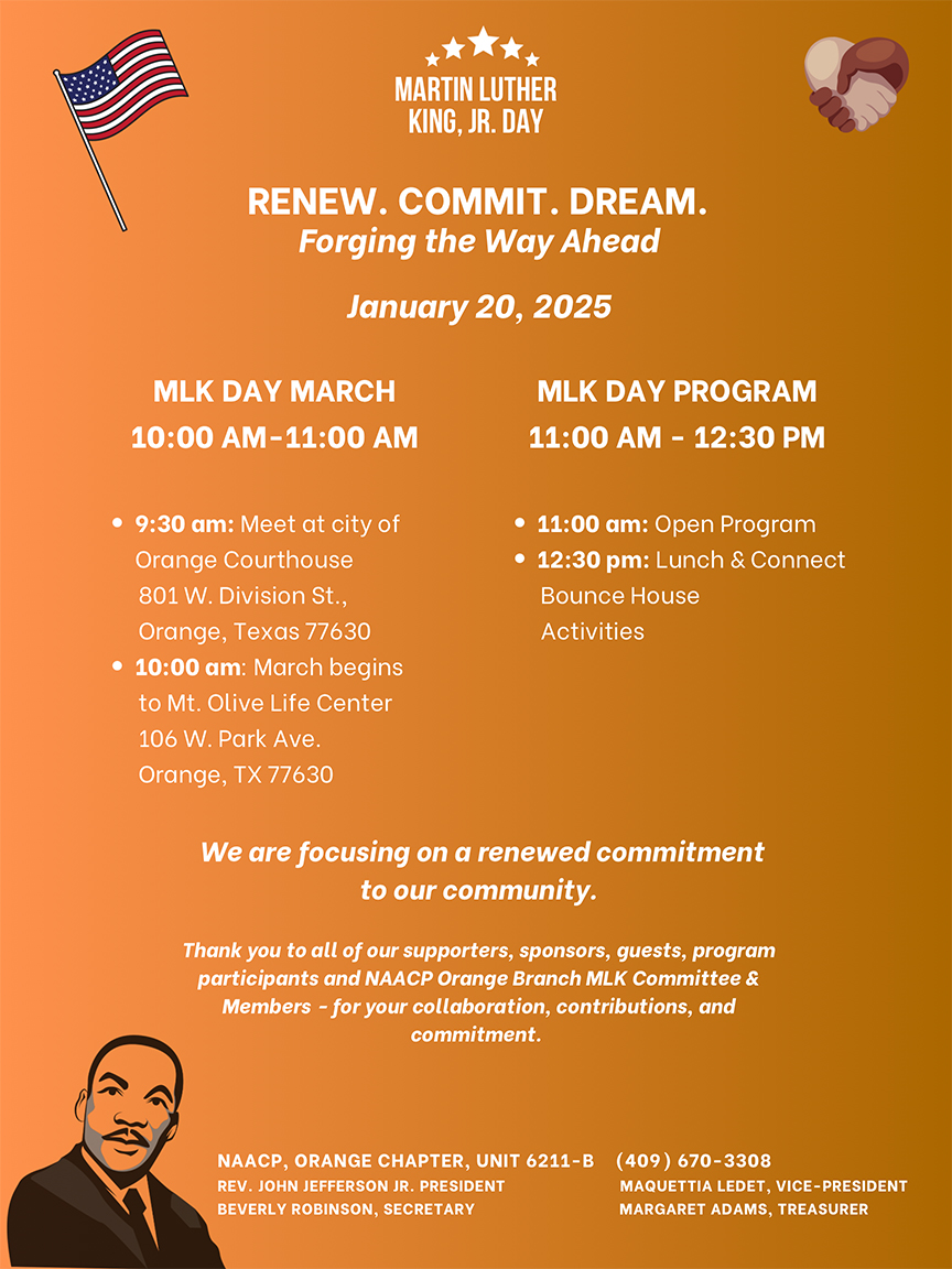 Please join Tracie and our family on MLK Day, January 15, as we take part in historic MLK Day March in Orange, Texas, where Tracie grew up and her family still lives.