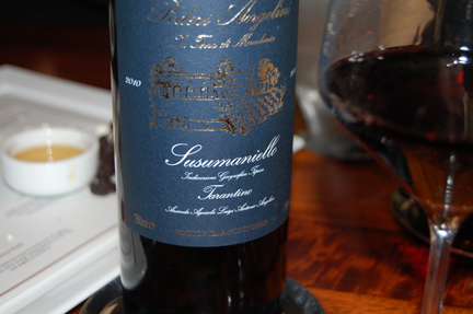 But Angelini’s 2010 Susumaniello was delicious last night: bright and surprisingly light on the palate, with the acidity that we crave, high but balanced alcohol, and juicy, chewy red berry fruit. I loved it, as did the group of wine professionals with whom we tasted it.