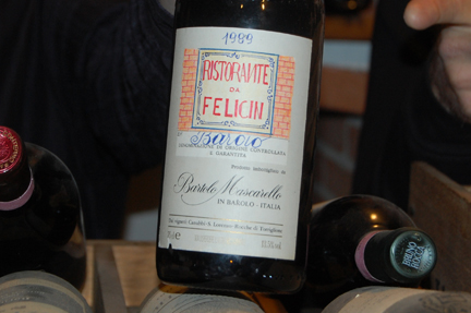 The Barbera 7 ended its week-long tour of tastings and winery visits in Asti and Langa with some old Nebbiolo at the legendary Da Felicin in Monforte d’Alba. The last wine we opened together was a 1978 Franco-Fiorina Barbaresco, a bygone bottle, to borrow Eric’s phrase. Not everyone agreed with my assessment of the wine but I thought it was fantastic (Frank and Charles would have loved it, I’m sure, for I have drunk many old expressions of such great Nebbiolo with them).