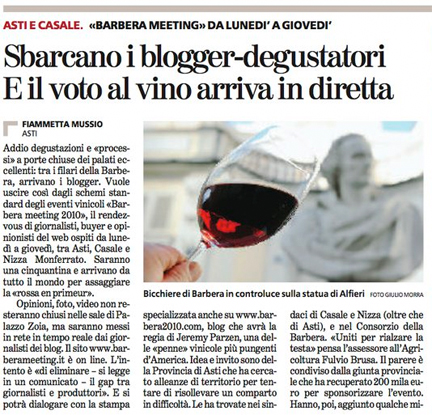 Above: The Torino local edition of La Stampa published this article today on Barbera Meeting 2010 and the novelty of having a group of American bloggers present. Click image for a PDF of the article or become a fan of Barbera Meeting on Facebook for the whole text.