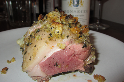 The bottle we shared (thanks to Dan, paired with BrooklynGuy’s stunning bread-crumb- and marjoram-encrusted rack of lamb, above) had a strip label on the front that reported: “selected and shipped by Neil Empson, Milan.” On the back, there was a round label that reported: “Acquired from a private cellar [by] Acker, Merrall, & Condit,” the famed rare wine broker of the Upper West Side of Manhattan.