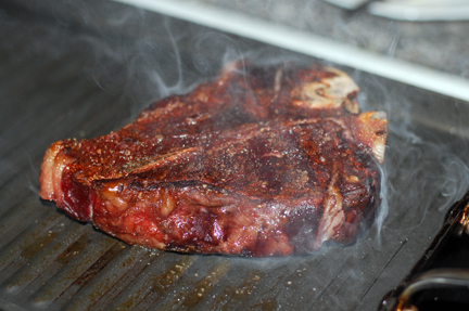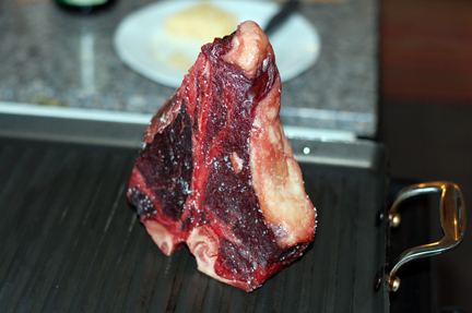 When you see the marrow begin to bubble in the bone, quickly grill the steak on either side at high heat.