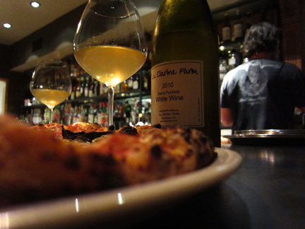 After my shift was done at Sotto last night, I sat down with my good buddy (man, we go WAY back) Nieves and shared a bottle of Hank Beckmeyer’s 2010 Clarine Farm White Wine (Rhône white blend) and a couple of margherite (mine spiked with salt-cured anchovies).