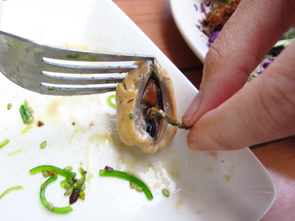 Just had to share this photo of a mussel from lunch today at one of our all-time favorite seafood joints, Bay Park Fish Co. in San Diego where we’ll be staying for the next days (Tracie P got in last night). I cannot recommend this place highly enough. And what can I say? One man’s mussel is another’s Rorschach test.
