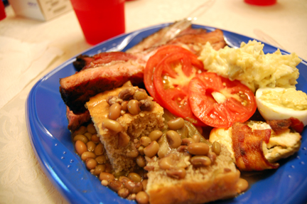 Purple hull peas, cooked with okra and served over crumbled cast-iron-skillet-fired corn bread was the highlight of dinner at Uncle Tim and aunt Ida Jean’s house on Cow Bayou. I had two servings of Tim’s award-winning potato salad.