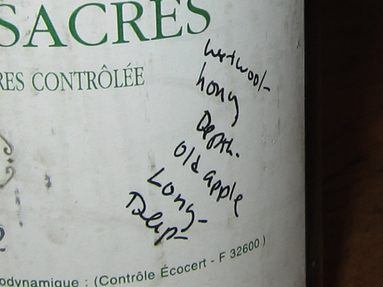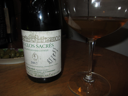 The 2005 Savennieres Les Clos Sacrés was oxidized and unctuous, “mouth watering,” in Tracie B’s words (I’ll leave you salivating for her tasting notes at My Life Italian).