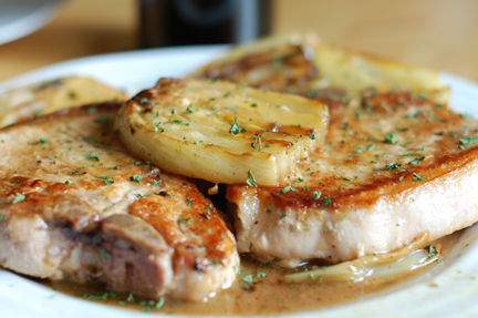 In the meantime, add the remaining wine to the pan over medium heat. When the alcohol has evaporated, add the remaining stock, the reserved fennel and its sauce, and reduce to desired consistency. Remove the fennel from the pan and reserve and then filter the sauce using a fine strainer (n.b.: in the time that it takes you to reduce the sauce, the pork chops will have cooked through).