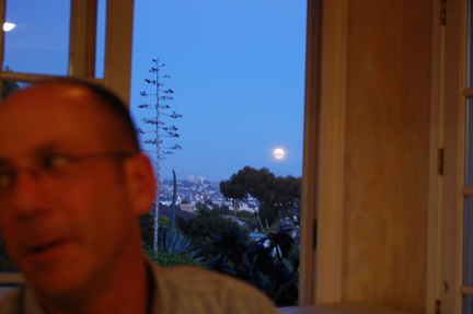 Above (literally “above”): I took this picture of the full moon over San Diego on the first night of the Passover, the night before the first day, during my family’s Passover seder.