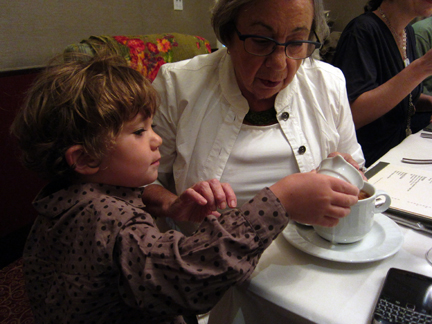Grandson Oscar poured milk into mama Judy’s coffee for an early family breakfast.