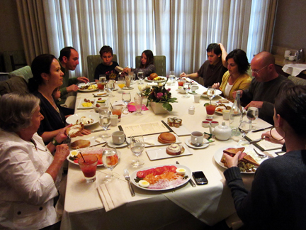 There were eleven of us for eggs in all kinds of styles and lox and Bloody Marys at Nine Ten, the restaurant in the hotel where Tracie P and I got married in La Jolla, the Grand Colonial, home of the Parzen family’s official Sunday brunch.