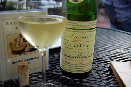 Tracie P and I started her birthday weekend off with cousins Joanne and Marty on the patio at the Backstreet Café in Houston, where our friend, sommelier Sean Beck, poured us this AWESOME 2008 dry Muscat from Weinbach (Alsace), a classic expression of the grape (which I was tasting for the first time).