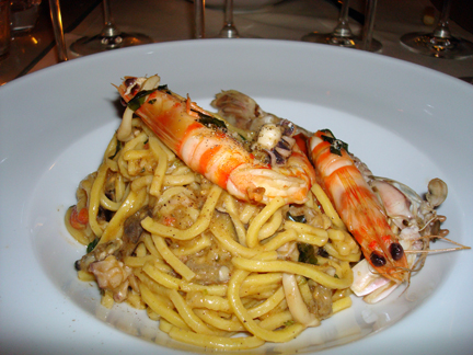 The 2009 Morellino di Scansano by Poggio Argentiera paired stunningly well with this medley of seafood and noodles at the Oasi in Follonica. It’s not uncommon to pair red wine with seafood in the Maremma, where Sangiovese is expressed as a lighter and more gently tannic wine than it is in places like Montalcino and Chianti.
