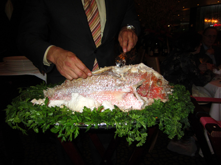 Whole, salt-encrusted Gulf of Mexico red snapper, filleted tableside…